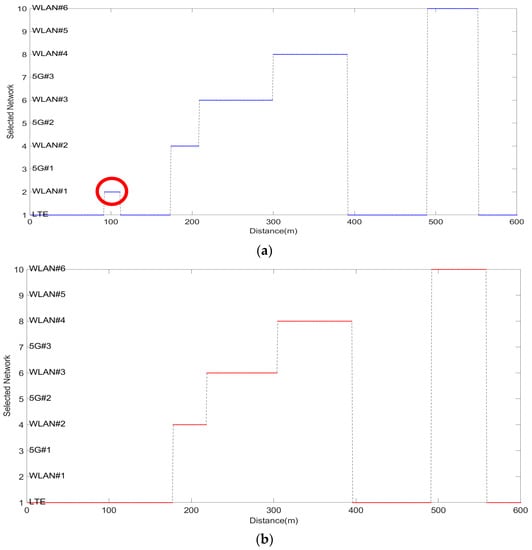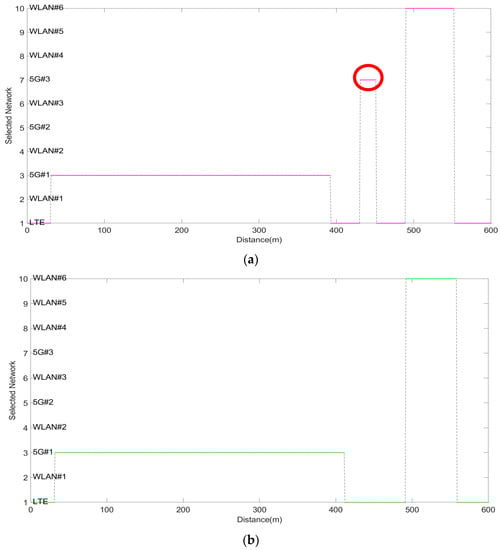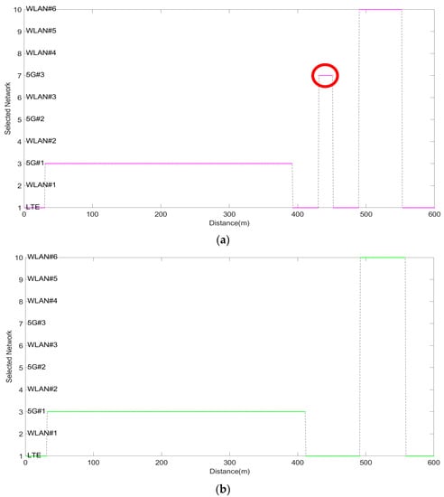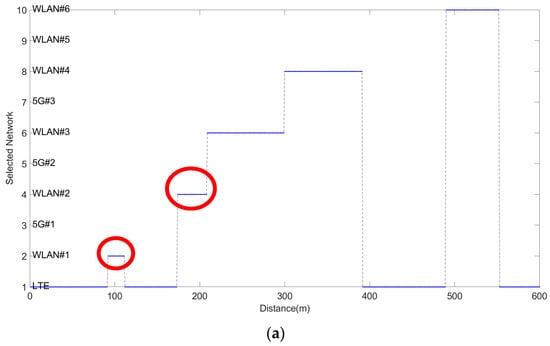 Handover performed based on QoS preference at the speed of 70 km/h: (a) TOPSIS-based handover algorithm (circle shows unnecessary handover), (b) proposed handover algorithm.