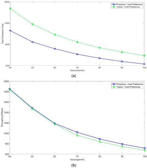 Referring to Table 5, the algorithms give the highest priority to WLAN, which has the lowest network connection cost, and then continue to LTE and 5G. Figure 12a shows that the proposed algorithm reduces the total connection cost up to 27.51% compared with the TOPSIS-based handover algorithm. In terms of throughput, the proposed algorithm is 3.06% higher than the TOPSIS-based handover algorithm, as shown in Figure 12b. At the lower speed (40 to 60 km/h), there is a small throughput difference between the two algorithms, as fewer unnecessary handovers occur at low speeds. More unnecessary handovers induced at higher speeds (70 to 100 km/h) caused the throughput to decrease significantly for the TOPSIS-based handover algorithm. The unnecessary handovers are a waste of network resources.