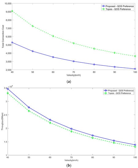 Figure 13 shows the total connection cost and throughput achieved by the proposed handover algorithm and TOPSIS-based handover algorithm based on the QoS preference. In this case, the MT is biased toward the 5G network, which offers high service quality. The TOPSIS-based handover algorithm connects to the 5G network wherever it is available. Figure 13a shows that the total connection cost of the proposed algorithm is 40.81% lower than that of the TOPSIS-based handover algorithm. In terms of throughput, the proposed algorithm is 5.12% better than the TOPSIS-based handover algorithm. For example, the unnecessary handover to network 5G#3 (as shown in Figure 10a and Figure 11a) performed by the TOPSIS-based handover algorithm is a waste of cost and network resources.