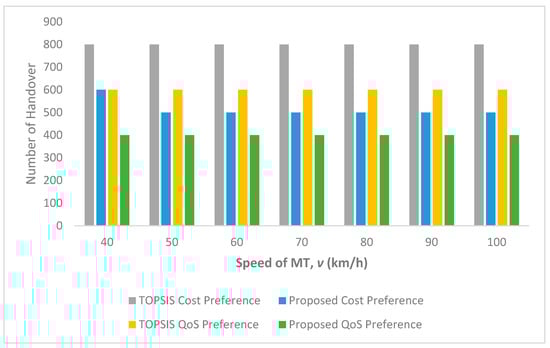 Figure 14 shows the number of handovers performed by the proposed algorithm and TOPSIS-based handover algorithm for both the cost preference and QoS Preference in a 100 loops simulation. The number of handovers for the TOPSIS algorithm on both preferences is higher than that of the proposed algorithm. Table 6 summarizes the performance of the prosed algorithm as compared with the TOPSIS-based handover algorithm.