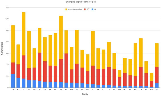 The percentage of organizations that use emerging IoT, AI, and cloud computing digital technologies in EU countries (data source: Eurostat [51]).