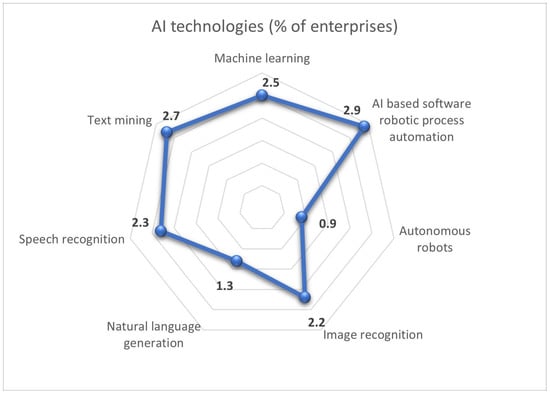 AI technologies used by organizations (average values for the year 2021 at EU level) (data source: Eurostat [51]).