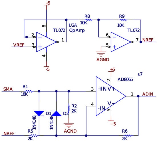 To limit the input range of the AD converter within the 1–3 V voltage supported by the ADC chip, an attenuation design for input voltage is needed. The signal conditioning circuit adopts AD8065 as an operational amplifier, which has the characteristics of high performance, low distortion, and high common mode rejection ratio, and is suitable for signal conditioning. The circuit diagram is shown in Figure 3. The reference voltage, VREF, is provided by the ADC chip. The signal undergoes voltage following and voltage inverter by TL072U1, becoming NREF. After the signal from SMA undergoes the resistive voltage divider, it enters the positive terminal of AD8065, and the negative input comes from NREF. The relationship between the output and input signals is as Equation (5).