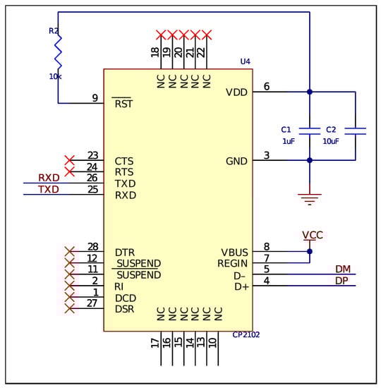 The CP2102USB is a widely used Serial to USB chip that offers fast transmission, low power consumption, high stability, and straightforward integration. These make makes it an ideal choice for reliably converting the serial signal from the FPGA controller into a USB signal, which can then be transmitted to a computer for further analysis of frequency domain signals processed on the FPGA. The Serial to USB circuit is shown in Figure 4. Many of its pins are not utilized. The most important signals in serial communication are RXD and TXD. They respectively represent receiving data and sending data. D+ and D− respectively represent the positive and negative poles in the USB signal. When data is to be transmitted, the signal is divided into differential signals and transmitted to the connected device.