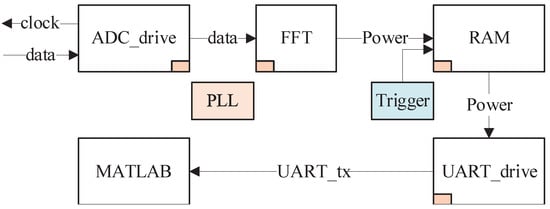 This design is written in Verilog language, and the Quartus II 18.1 software is used as the running software. The design employs a modular structure that enables the instantiation of various functional modules within the FPGA. The overall signal flowchart is shown in Figure 5. First, the signal is sampled by an AD converter, which is driven by a clock generated by the FPGA, and it is then subjected to FFT for a predetermined number of points, resulting in the desired point results. Once the output meets the trigger signal, the data points are stored in the random access memory (RAM) and transmitted to Matlab via a Serial to USB interface circuit for advanced analysis and processing to obtain a spectrum. The process utilized is inherently fast, accurate, and wel-suited to many signal processing applications.