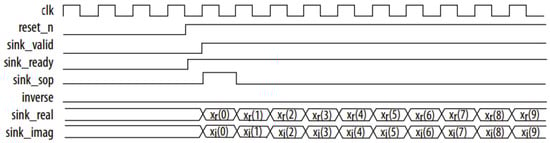 The burst I/O data flow FFT is shown as Figure 7. The FFT control module is responsible for controlling the first and last input sink_sop and sink_eop provided to the IP core and determining the effective time sink_valid of the input signal. Additionally, it is in charge of generating the reset signal reset_n, as reported in [18]; sink_ready is a signal that comes from the IP itself, indicating that it is ready to receive data. The IP will only receive data when both sink_valid and sink_ready is high. For the program design in this article, it is necessary to define a counting cycle signal that exceeds the sum of the FFT operation and delay time, which serves as a complete FFT cycle. The first and 4096th elements are selected as sink_sop and sink_eop, respectively. These control signals are combined with the instantiated FFT IP core. Full-phase Fourier transform should be utilized when phase order needs to be considered for signals collected by AD. This design does not need phase information and therefore directly assigns the imaginary part sink_imag of the input to FFT IP as 0 [29], while sink_real comes from the AD module.