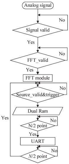 The overall signal flowchart is shown in Figure 8. After the input signal becomes valid and both “sink_valid” and “sink_ready” are active (i.e., when FFT_valid is high in the figure), the signal is fed into the FFT module. When there is an effective signal output and a trigger signal with a high level, the signal begins to be stored in the dual-port RAM for N/2 values. Once N/2 values have been stored, they are sent out via a serial port. The program then waits for the next output to become valid and for the trigger signal to become high.