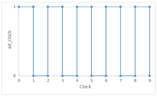 In order to verify whether the designed system can work properly, a series of experiments need to be conducted. After the designed acquisition board was prototyped and soldered through the PCB, its input signal line was led out through the SMA interface and connected to the signal generator line in ADALM2000. In the written program, the sampling rate was set to 25 MHz and the FFT points were set to 4096. The written program was then burned into the FPGA chip through Quartus II. The ADALM2000 Multifunctional Module was used as the signal generator, and its corresponding changes were observed through the online debugging tool Signaltap in Quartus. Initially, the clock provided by the FPGA to the ADC was checked, and this verification is shown in Figure 9. This figure was drawn by importing data from the online logic analyzer into Excel. It is evident that the generated clock signal is 25 MHz as we use the system 50 MHz clock to observe.