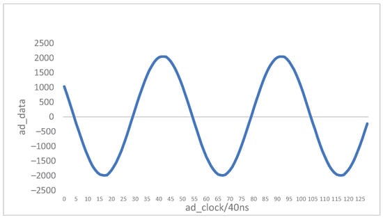 Next, a single-frequency 500 k signal of 10V Vpp was applied to test the response of the AC signal. The acquired waveform takes 50 clock cycles under a 25 MHz clock. The maximum value of the waveform was 2047. However, due to DC bias, the minimum value was −1985, as seen in Figure 10. This error does not affect the frequency measurement. From the figure, it can be seen that the frequency of the signal is 50 cycles under the current AD clock, corresponding to 500 kHz, verifying the correctness of the waveform acquisition by the FPGA and AD.