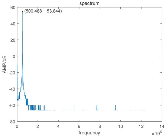 The data sent by the FPGA are imported into the MATLAB serial tool for further processing. The incoming binary signal requires concatenation and binary conversion to retrieve the original 24-bit value. The value is then square rooted and corrected by dividing the amplitude by the transformation point number N following the principles of FFT. The abscissa of the frequency value can be obtained through Equation (6). Typically, spectral graphs are represented using logarithmic coordinates.