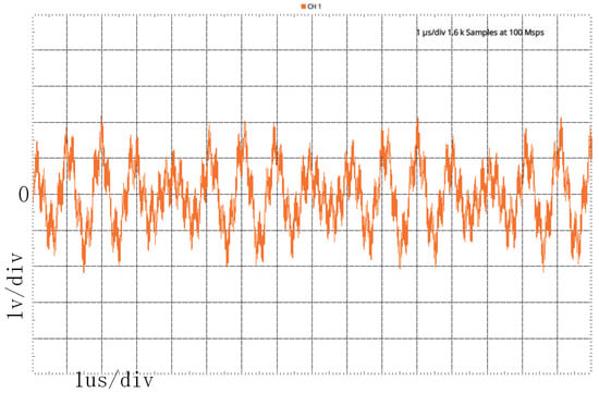 Next, the mixed frequency signal is tested by generating a composite signal of three different frequencies using an 8 bit DAC along with the FPGA. FPGAs are capable of generating digital signals on their own.To produce test signals for this experiment, the numerically controlled oscillator (NCO) IP core was employed to generate digital sine or cosine waveforms, which were subsequently converted into analog signals through a DAC module. The generated signals demonstrated high accuracy and stability, meeting the requirements of the experiment. In this experiment, three different frequencies were generated using the NCO IP core: 995 kHz representing Ozone, 1219 kHz representing Oxygen, and 4879 kHz representing Hydrogen. The signal generated at 995 kHz is adjusted to twice the amplitude of the other two and is used to verify the system’s ability to determine amplitude. The AD9708 module outputs the mixed frequency signal, as shown in Figure 12. The signal is observed through the direct use of the oscilloscope in ADALM2000. The voltage is within the range of ±5 V. However, useful information cannot be obtained in the time domain.