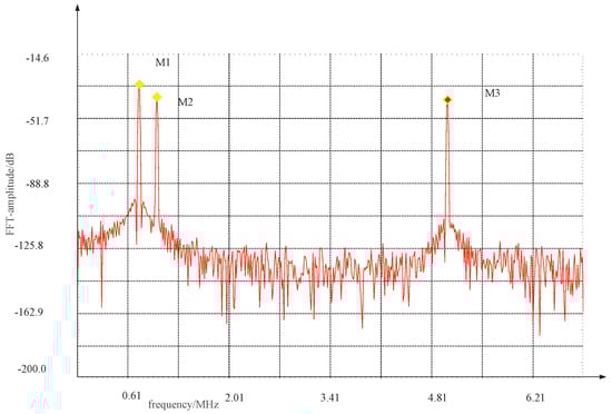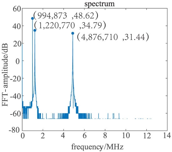 As for the system we designed, after being processed by the MATLAB host computer, the measured frequency signals (including some miscellaneous signals) in this article can be displayed. By manually selecting the three highest peak points, the frequency detection results of the data acquisition system can be obtained. The detected frequency signals of the acquisition system designed in this study were 995 kHz, 1221 kHz, and 4877 kHz, as shown in Figure 14. Because the frequency was not known in advance, there is a certain degree of spectral leakage, which can affect the measured frequency and amplitude. The measurement results of both methods had a certain error, but both were within 7 kHz of error and were mostly consistent with the theoretical spectral values, with correct line positions and similar spectral waveforms. The relative amplitude sizes also conform to the input test conditions. As the present experiment did not require extensive emphasis on amplitude information but only relative comparisons of amplitude, we did not perform much amplitude calibration.