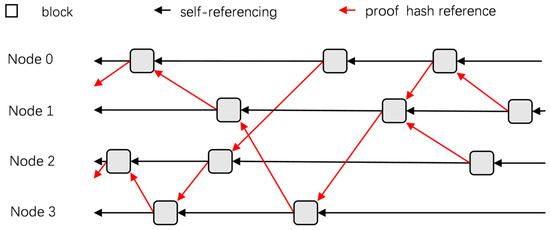 This paper proposes a novel DAG structure built upon self-referencing parallel chains. In this structure, each node maintains an independent parallel chain. When nodes publish blocks, a specific parent hash pointer is required to connect to the node’s parallel chain, thereby establishing the desired self-referencing parallel chain structure. Furthermore, to facilitate inter-chain referencing, an additional pointer called the proof hash reference is computed and employed. The structure based on self-referencing parallel chains is shown in Figure 3.