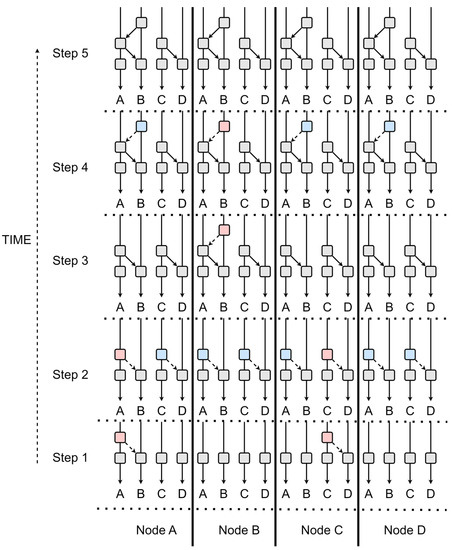 Figure 6 is an example of the consensus algorithm with four nodes, where blue blocks represent the received blocks, and red blocks represent the self-generated blocks. The rules of the consensus are described in detail below. In step 1, node A and node C want to publish blocks. After building the block, node A and node C simultaneously send the block to other nodes in the network for verification and voting except for themselves. In step 2, nodes B, C, and D received the block message from node A, and nodes A, B, and D received the block message from node C. In step 3, nodes A, B, C, and D will each count the number of approval votes for the blocks built on nodes A and C. At the same time, node B starts packing transactions to build a block, step 1. In step 4, nodes A, B, C, and D will each independently track the construction progress of the block by other nodes except themselves. Meanwhile, nodes A, C, and D will verify and vote on the block constructed by node B, which is step 2. Finally, in step 5, A, B, C, and D have reached a consensus, and all nodes have built the same DAG ledger locally.