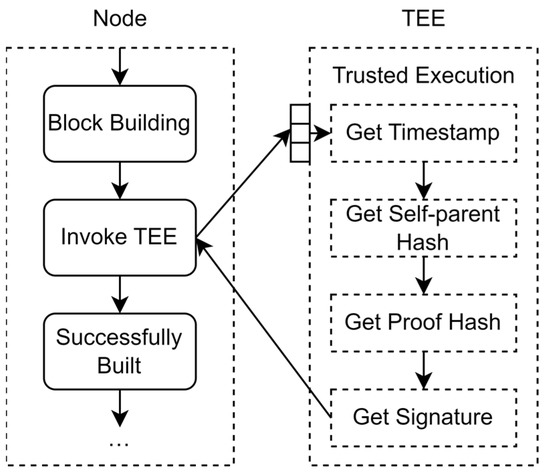 Step 1: Before publishing a block, the node first needs to package its transactions to build a block. The block header and block body are set according to relevant information, and then a block is generated. Next, the node calls the TEE to compute and set the self-parent hash and proof hash of the block header and signs the block to obtain a signature. The operations involving the TEE will be explained in detail in the next section.