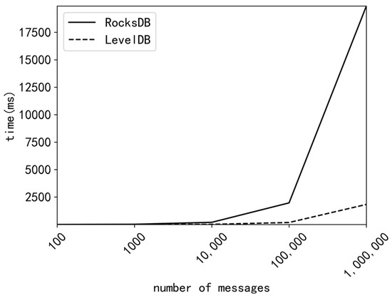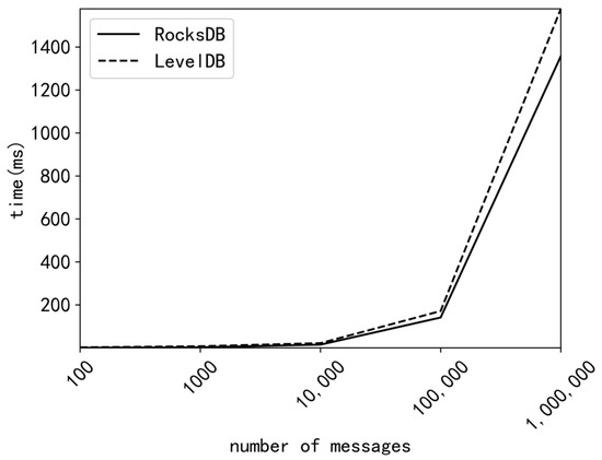 This experiment aimed to assess the read and write efficiency of two widely used KV databases in distributed ledgers, LevelDB and RocksDB. Different numbers of messages were read and written using these two databases, and the time was recorded. The experimental results are shown in Figure 10 and Figure 11. The experiment showed that LevelDB has higher efficiency in writing, while RocksDB has higher efficiency in reading. Therefore, LevelDB is suitable for scenarios with more writes and fewer reads, while RocksDB is suitable for scenarios with more reads and fewer writes. However, as LevelDB has an advantage in writing efficiency and the difference in reading efficiency between LevelDB and RocksDB is not significant, this study opts to utilize LevelDB as the database for the distributed ledger system.