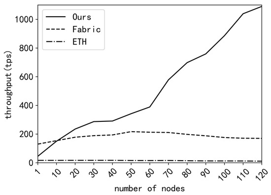 As illustrated in Figure 12, the throughput of the DAG-based distributed ledger demonstrates an increasing trend as the number of nodes increases, indicating a significant enhancement in node concurrency. The throughput of Fabric is influenced by various factors, including network bandwidth, the number of nodes, the size of the transaction, and more. Under different experimental conditions, the throughput of Fabric may vary greatly. Due to limitations imposed by environmental factors, the throughput of Fabric tends to decline under high load conditions. It should be noted that Fabric does not pursue high throughput but focuses more on scalability, security, flexibility, and other aspects. Ethereum is a classic public chain that has become very mature and stable after many years of development. Therefore, it can be found throughput of Ethereum is relatively stable and does not increase with the growth of nodes, which is also the drawback of traditional proof-of-work consensus.