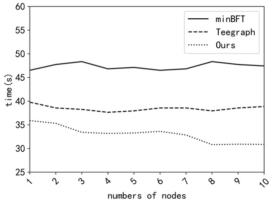 In this experiment, MinBFT and Teegraph were utilized as baseline methods for signing and verifying a specific number of messages. In addition, this experiment uses these two schemes and the proposed approach to compare relevant usage time. Specifically, 500,000 messages were signed and verified by using MinBFT, Teegraph, and the proposed approach separately, and the time spent by each method was recorded. The experimental results are presented in Figure 13 and Figure 14.