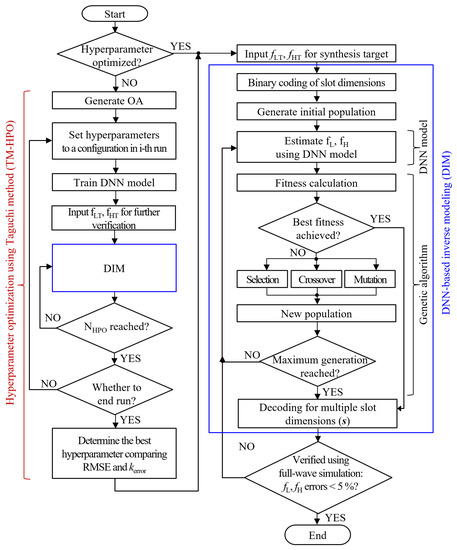 Finally, the best hyperparameters were determined by comparing the error values of all runs, as shown in (4). The optimal hyperparameters were employed in the hybrid model of DIM, which was primarily used for EBG synthesis. With these best hyperparameters, the HD-EBG structures were synthesized in the DIM part, as shown in Figure 1. DIM mainly contains two steps: the DNN-GA hybrid model and further verification based on the dispersion analysis with full-wave simulation. The DNN-GA hybrid model yielded the optimal values of the slot dimensions for the given objectives of fLT and fHT. In the further verification step of DIM, fLE and fHE were acquired by conducting dispersion analysis with the full-wave simulation of the HD-EBG structure corresponding to . Although the optimal hyperparameters were extracted in TM-HPO, errors between the target values (i.e., fLT and fHT) and the synthesis results (i.e., fLE and fHE) can exist due to the uncertainty of the DNN model. This problem was solved by employing a further verification step using a full-wave simulation. This led to an increase in the synthesis time. However, the time increase was quite small compared to a conventional method, which fully adopts full-wave simulation as a forward model. In the further verification step, the DIM step was repeated NDIM times until the errors of both fLE and fHE reached <5%. Afterward, the final solution of the slot dimensions for the HD-EBG structure was obtained.