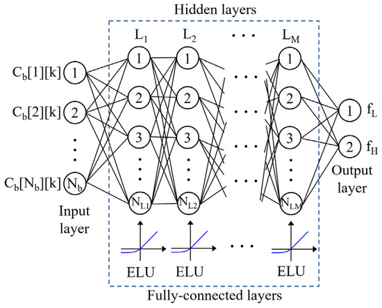 The proposed EBG synthesis method mainly consists of two parts: the Taguchi-method-based HPO (TM-HPO) and DNN-based inverse modeling (DIM), as shown in Figure 1. In both steps, the hybrid model containing the DNN forward model and GA optimization is adopted. The proposed hybrid model efficiently achieves an indirect inverse model for the HD-EBG structure. A DNN forward model is constructed, as shown in Figure 2. The input of the DNN model is the binary array s of the design parameters for an HD-EBG structure. The output is the array f of the low and high cutoff frequencies (fL and fH) expressed in decimals. The DNN model in the proposed EBG synthesis method contains fully connected layers comprising an input layer with Nb neurons, M hidden layers with NL(i) neurons, and an output layer with two neurons. The input array s is used as the binary-coded chromosome in the GA, and its size is denoted as Nb. k represents the kth run of the orthogonal array (OA) of Lj(Si) obtained via the Taguchi method, which is used in the TM-HPO. The Taguchi method is proposed for the robust design of engineering problems. By using the Taguchi method, experiment sets are given, which consist of a variety of design parameters that require investigation by changing them from one value to another. The results obtained from completing Taguchi experiments provide insight into the effects of various design parameters. This leads to the efficient design of complex problems suffering from extensive design space. Taguchi experiments are designed using an orthogonal array. The number of design variables and their levels determine the size of the orthogonal array. In this study, we employ the Taguchi method to efficiently reduce the design space. ELU is employed as an activation function. It enables one to avoid a vanishing gradient problem and improve learning characteristics [28].