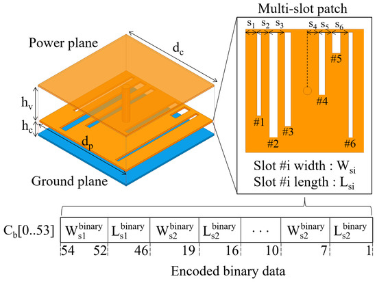 In addition to the DNN model, the GA was adopted in the proposed DIM. To explain this, a multi-slot patch EBG structure was employed as an example of an HD-EBG structure, as shown in Figure 3. The unit cell of the multi-slot EBG structure consisted of a power plane, ground plane, and perforated patch, where six different slots were etched. In the design of the HD-EBG structure, the values of the unit cell size dc, via radius rv and length hv, and the distance hc between the patch and the ground plane were employed. These variables are typically preferred not to change because they are constrained by the stack-up and layout of high-speed packages and boards. Consequently, the slot dimensions were determined as the primary design variables because they rarely affect stack-up and layout. The slot dimensions were width wsi and length Lsi of the ith slot. They were adjusted to obtain the EBG design satisfying the targets fL and fH, which are represented as fLT and fHT. The dimensions of the slots were encoded as a binary array, as shown in Figure 3, since the values of the input layer in the DNN model were updated using the optimization method based on the binary GA. The length of the input binary array was 54 bits. It consisted of six subarrays, where three and six bits were used to denote the width and length of each slot, respectively.