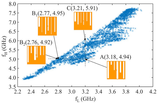 Regarding the datasets for the training and validation of a DNN model, the datasets were obtained using 1D dispersion analysis and a full-wave simulation of various slot dimensions. Furthermore, 4212 and 1052 simulation results were acquired for the training and validation of the DNN model, respectively. The relationship between fL and fH for the datasets is shown in Figure 4. As shown in the datasets, the design space of the HD-EBG structure is not a simple linear curve. It exhibits multiple solutions that reflect its ability to tune cutoff frequencies and its non-unique characteristics.