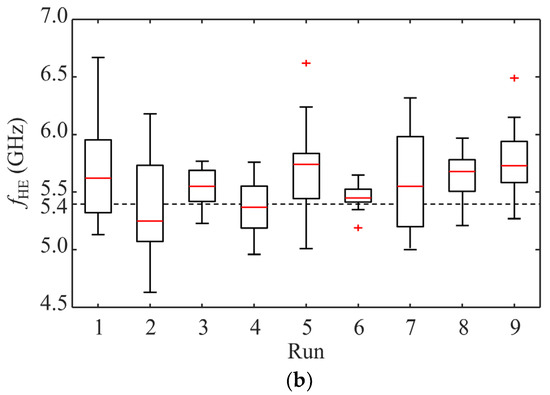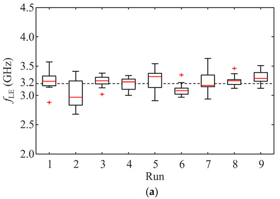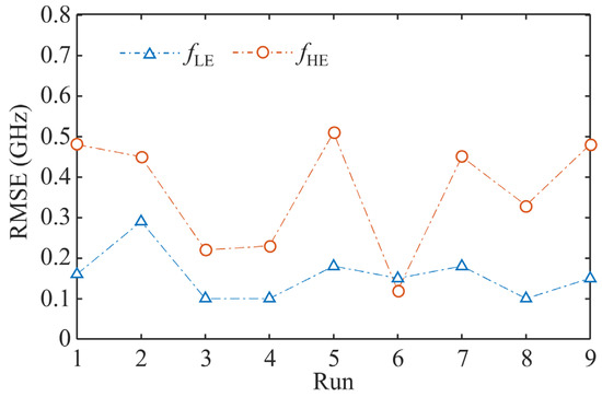 Now, the TM-HPO was applied and the results were obtained. The OA values are presented in Table 2. For further verification, the values of fLT,HPO and fHT,HPO were set to 3.2 and 5.4 GHz, respectively, which are commonly required to suppress power/ground noise in the high-speed package and PCB applications. In each run of the OA, 15 fLE and fHE values were acquired (i.e., N = 15) for the same fLT,HPO and fHT,HPO. The results of 15 fLE and fHE values for all runs are summarized using box plots in Figure 5. The box plots indicate that the different configurations of the hyperparameter significantly affect the estimated results of fLE and fHE. Observing the results of run 1, the minimum Q1, median Q3, and maximum of fLE are 3.14, 3.17, 3.24, 3.33, and 3.57 GHz, respectively, while those of fHE are 5.13, 5.32, 5.62, 5.95, and 6.67 GHz. The results of the other runs exhibit similarly distributed values. It is observed that the interquartile ranges of fLE in runs 3, 6, and 8 are relatively narrow, while that of fHE in run 6 is narrower than that in all runs. This characteristic was further examined using RMSE as shown in Figure 6.