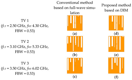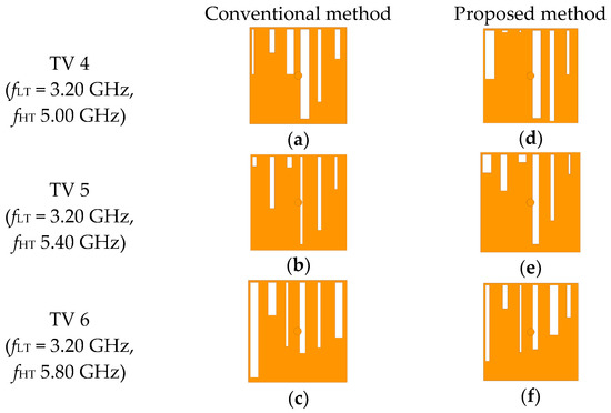 A crucial advantage of the proposed method is the substantial reduction in synthesis time, as shown in Figure 11. In the scenario of constant FBW, the synthesis times of TVs 1, 2, and 3 using the conventional method are 50,946, 55,111, and 45,909 s, respectively, while those of the DIM are 767, 520, and 706 s, respectively. The proposed DIM remarkably achieves a reduction in the synthesis time of 98.5, 99.1, and 98.5%, compared to the conventional method. In the second scenario of fH extension, the conventional method took 25,206 s for TV 4, 43,494 s for TV 5, and 46,750 s for TV 6. However, using the proposed DIM, the synthesis times for TVs 4, 5, and 6 were 400, 80, and 239 s, respectively. The DIM achieves 98.4, 99.8, and 99.5% reductions in computation time for synthesizing TVs 4, 5, and 6, respectively. The proposed DIM shows excellent performance in terms of the computation time for synthesizing the HD-EBG structure. The proposed DIM successfully demonstrates its ability to rapidly synthesize HD-EBG structures and solve the challenging problem of complex design.