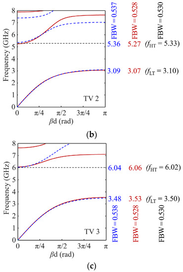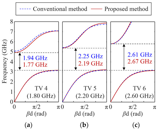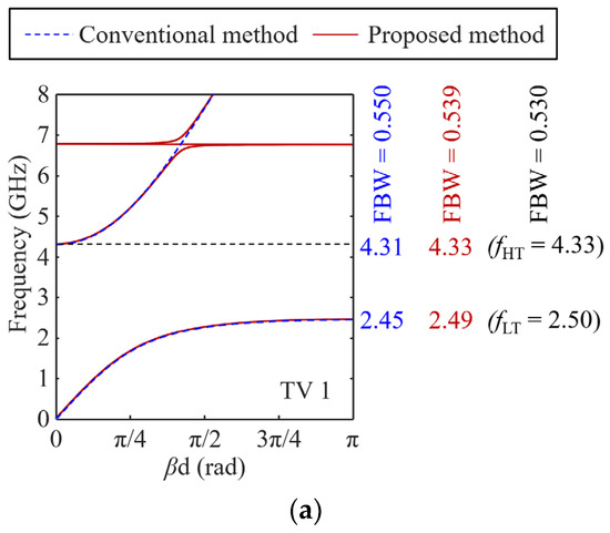 Examining the synthesis results of the conventional method, the fL and fH errors for TVs 4, 5, and 6 are 2.2, 1.4, 0.6, 0.6, 0.6, and 0.2%, respectively. Compared to the maximum error in the conventional method, it is concluded that the proposed DIM achieves accurate results. In this design challenge, it is interesting that the solutions of the DIM and conventional methods are different, as shown in Figure 9, although their dispersion characteristics are quite similar, as shown in Figure 10. As shown here, it is demonstrated that the proposed DIM solves the design challenge of extending the stopband bandwidth while maintaining fL.