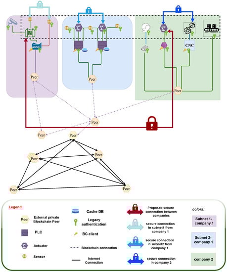 The private blockchain network that connects the factories and enables cooperation was described in Section 3.1. Nodes within this network are certified and use PKI for secure communication. Communication between blockchain nodes takes place over the internet, utilizing the TCP/IP protocol.