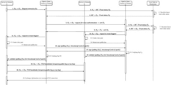 In the process of cross-authentication, users in different network domains are authenticated through the issuance of cross-certificates across multiple certificate authorities []. This approach involves trust anchor certificate authorities utilizing their private keys to issue digital certificates, establishing trust between domains.