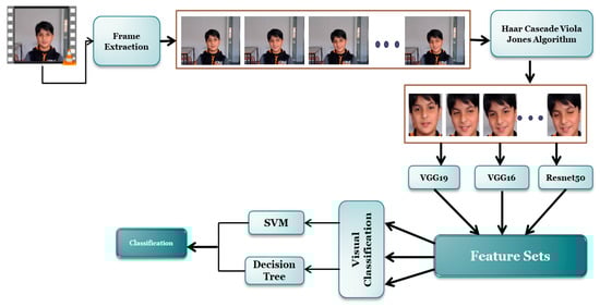 This section explains our proposed methodology in detail. The primary steps include: pre-processing (frame extraction, face detection), feature extraction, and classification. Our emotion recognition system utilizes a uni-model approach, focusing solely on visual content extracted from video clips in the emotional corpuses. In the initial stage, preprocessing is necessary to prepare the visual data for input into the neural network. This involves extracting frames from the video corpuses and isolating the face area within those frames. Next, distinct feature sets are extracted from the frames using three networks, namely VGG16, VGG19, and Resnet50. This step is performed for both video- and image-based classification, although the methodology for dividing the samples (i.e., frames) into train and test sets differs between the two approaches. The features extracted from these frames are then used to train two image classifiers, namely Support Vector Machine and Decision Tree, in order to evaluate the representational power of these features. Figure 1 represents a visual representation of our proposed methodology.