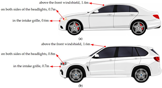 (a) The location and height of hybrid solid-state LiDAR on sedan. (b) The location and height of hybrid solid-state LiDAR on SUV.