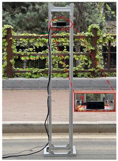 To determine the installation position of the hybrid solid-state LiDAR on the vehicle, a LiDAR mounting bracket with two degrees of freedom is designed. The fixation plate can rotate along the pitch direction and slide vertically and is used to place the hybrid solid-state LiDAR. The spatial coordinate system is established according to the right-hand rule. The direction from the origin O of the coordinate system to the positive direction of the X-axis is defined as the initial 0° rotation around the Y-axis. When the view from the positive direction of the Y-axis is towards the origin O of the coordinate system, the counterclockwise direction is defined as the positive direction of rotation around the Y-axis. The angle range of the fixation plate rotating around the Y-axis is from 0° to 15°. The height range of the fixation plate sliding along the Z-axis is from 0.1 m to 1.7 m. The LiDAR mounting bracket and its coordinate system are shown in Figure 2.