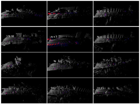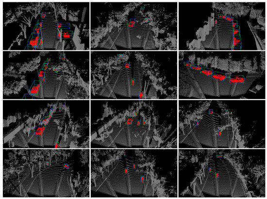 From Table 3, it can be seen that the point-based method has better performance than the voxel-based methods, and that the auxiliary network can aid feature representation. The PointRCNN has lower AP for pedestrian object at LEVEL_2, which may be due to the sparsity of the point cloud for distant pedestrians, resulting in insufficient neighbor point features being relied upon by the PointRCNN model. As the distance increases, the object point cloud gradually becomes sparse, leading to a decline in the detection performance of the object. We found that the AP of cars in the test results is lower than that of cyclists and pedestrians. This may be due to the fact that, in some scenes, vehicles are parked along the roadside sequentially, with the preceding vehicle occluding the shape features of the following vehicle’s point cloud. The horizontal FOV of the hybrid solid-state LiDAR is only 120°. When the object vehicle enters or exits the blind spot of the ego vehicle, no point cloud data are in the parts of the object vehicle outside of the coverage area of the LiDAR. However, as the distance between the object vehicle and the ego vehicle is relatively close, the object still requires special attention; thus, it is annotated. This is another reason why the AP of cars is lower than that of cyclists and pedestrians. The trained PointPillars model is applied to the test set for inference. A visualization of the results is shown in Figure 8. The predicted and ground truth bounding boxes are shown in green and blue, respectively. The object point cloud within the 3D bounding boxes are colored in red.