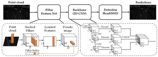 To establish the baseline for LiDAR-only 3D object detection, the typical voxel-based (SECOND, PointPillars, SA-SSD) and point-based (PointRCNN) methods were retrained, taking the widely deployed PointPillars algorithm for point cloud object detection as an example. As shown in Figure 7, the PointPillars network structure consists of three parts: a pillar encoder module that converts a point cloud to a sparse pseudo-image, a 2D convolutional backbone for feature extraction, a detection head for 3D boxes regression. PointPillars first divides the 3D space point cloud into pillars, extracts features using PointNet, and converts them into a sparse pseudo-image. Then, multiple 2D convolutions are utilized for downsampling to generate feature maps of different resolutions, which are aligned to the same size through multiple 2D deconvolution upsampling before being concatenated. Finally, the multi-scale features are fed into a region proposal network composed of 2D convolutional neural networks to regress the class, location, orientation, and scale.