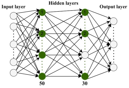Prior information is ignored in the AE, while an SAE learns a more satisfactory representation of the input data than a single AE. The hidden neurons in the proposed SAE for the two encoder layers are 50 and 30, respectively, as shown in Figure 2. An SAE functions essentially as a multi-layer AE. In this setup, the output from one layer provides the input for the subsequent layer. Typically, an SAE undergoes layer-by-layer training, a procedure commonly known as pretraining. Following this stage, the pre-trained network weights are amalgamated to establish the ultimate network weights. When using an SAE for feature selection, we begin by training the SAE on the input data, after which we utilize the encoded representations produced by the SAE as the new feature set. This new feature set possesses a smaller dimensionality and includes the most crucial attributes of the input data. Consequently, this can enhance the efficiency and performance of the classification model. The filter and automated features of SAE are combined to form the feature vector.