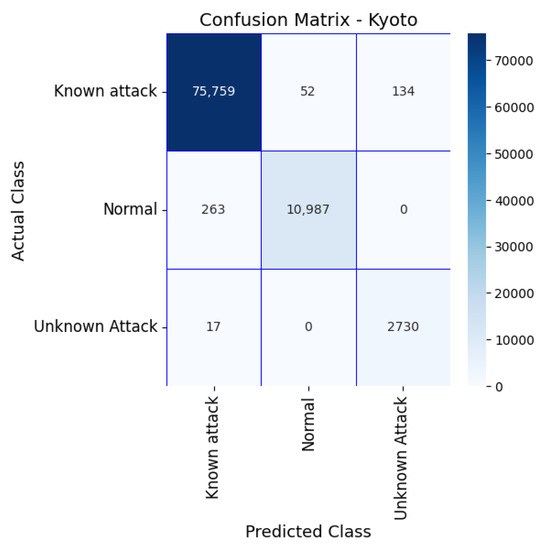 The Kyoto dataset was collected between 2006 and 2015 from a honeypot system [61], email servers, web crawlers, darknet sensors, and other servers installed at Kyoto University. In our research, we used the most recent dataset that contains traffic statistics through to 2015. The dataset has 24 features, 14 of which were gathered from KDD-99, and the other 10 are modern features that allow us to more properly investigate what occurred in our networks. Each record is classified according to a label, where 1 refers to normal traffic, −1 points out known attacks, and −2 indicates an unknown attack [26]. In the Kyoto dataset, there is no clear demarcation between the training and test sets and the dataset is extremely huge. As a result, we chose a random subset to test our assumptions, which is shown in Table 2.