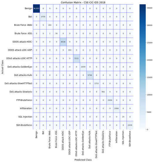 The Canadian Institute of Cybersecurity (CIC) with the Communications Security Establishment (CSE) created this dataset, which is a modernised version of CIC-IDS 2017 [62]. It is the most up-to-date launched dataset for intrusion detection research, which reflects the present real network environment, including seven traffic categories [36]: Benign, Botnet, Web Attacks, DDoS, DoS, Brute Force, Infilteration, and 14 types of labeled attacks with 84 features [63]. Additionally, there is no formal distinction between training and test sets in CSE-CIC-IDS 2018, and it is an excessively large dataset. Therefore, we randomly selected a subset to test our proposal, which is indicated in Table 3.