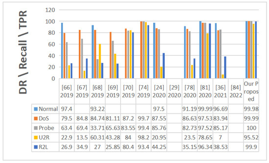 - Recall (R): It is the proportion of successfully recognized normal instances to the total number. Furthermore, it is called the detection rate (DR), sensitivity (S), or true positive rate (TPR). It is calculated according to: