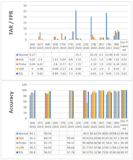 - False Alarm Rate (FAR): It calculates the ratio of records that are mistakenly detected as attacks to all records. Furthermore, it is names the false positive rate (FPR). It is estimated as follows: