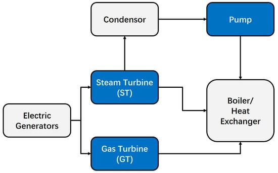 A CCPP system mainly is primarily composed of a gas turbine (GT), steam heat recovery generators (SHRGs), and a steam turbine (ST) []. In a CCPP, a GT produces both hot gases and electrical power (PE). These gases from the GT will then pass over a water-cooled heat exchanger (HE) to generate steam, which can be used to produce PE with the help of the ST in conjunction with coupled generators. Figure 1 shows a brief workflow of a Combined Cycle Power Plant.