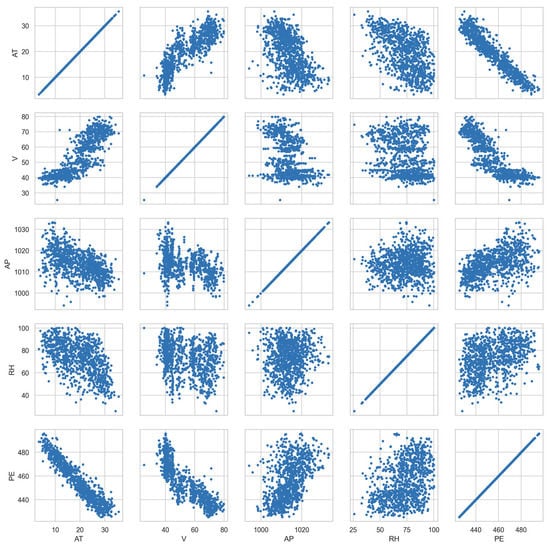 The Combined-Cycle Power Plant (CCPP) dataset consists of time-series data collected from a gas-fired power plant with a capacity of 420 MW over a period of six years, from 2006 to 2011 []. It is a widely used public dataset in the field of machine learning and energy systems. This dataset contains 9568 samples of hourly measurements of various features such as ambient temperature (AT), exhaust vacuum (V), ambient pressure (AP), and relative humidity (RH), as well as the net hourly electrical energy output (PE) of the power plant. The original dataset comprised 674 datasheets in .xls format, each representing a different day. However, this original dataset contained some noisy and incompatible data []. After a series of preprocessing steps, the incompatible data points that fell outside the acceptable range were filtered out. Additionally, noisy data, resulting from electrical disturbance interfering with the signal, were also eliminated. The publicly available CCPP dataset consisted of five sheets, each containing 9568 data items that had been randomly shuffled. To ensure the consistency of the experiments, the data analyzed in this study were specifically derived from Sheet 1. The description of CCPP dataset variables is listed in Table 1, and the pairwise scatter plot of the CCPP variables is demonstrated in Figure 2.
