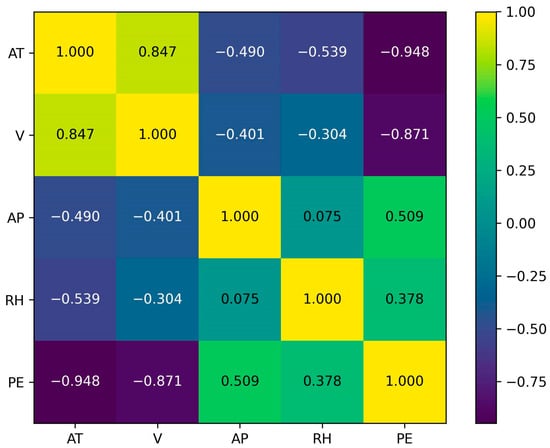 The Pearson correlation matrix displayed in Figure 3 illustrates the relationships between the variables in the CCPP dataset. In the Pearson correlation matrix, a positive coefficient value indicates a positive correlation, while a negative value indicates an inverse correlation between two variables. The larger the absolute value of the coefficient (more approximate to 1) is, the more strongly the two variables are correlated. On the contrary, a coefficient value of 0 implies no correlation between the variables. The correlation analysis presented in Figure 3 indicates that the independent variables AT and V, along with the dependent variable PE, have a negative correlation, with coefficient values ranging from −0.8 to −1. On the other hand, the correlation coefficient values between the independent variables AP and RH and the dependent variable PE are moderate, with values ranging from 0.2 to 0.6. Additionally, the independent variables AT and V are strongly positively correlated.