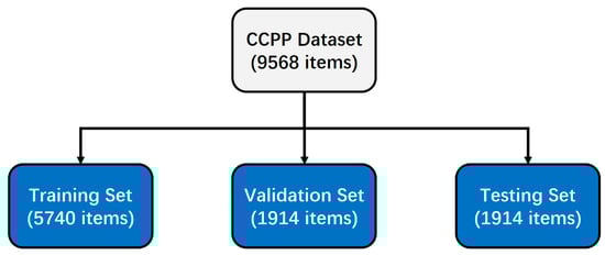 In the next step, we split the CCPP dataset into the training set, validation set, and testing set with a ratio of 6:2:2, as shown in Figure 4, where the training set is used to train the models, the validation set is for the selection of hyperparameters, and the testing set is for the evaluation of the performance of the models.