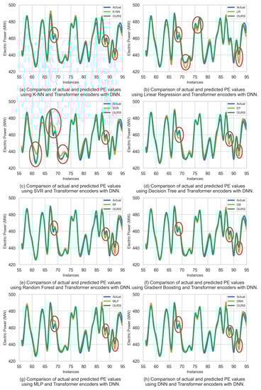 After processing the CCPP dataset, six machine learning algorithms were conducted to predict the PE data for comparison experiments. In addition, MLP, DNN, and Transformer encoders with DNN models were constructed for prediction. The experimental results indicate that the proposed model is more effective than the other models mentioned, with the root mean square error (RMSE) = 3.5370, the mean absolute error (MAE) = 2.4033, the mean absolute percentage error (MAPE) = 0.5307%, and the R2 = 0.9555. The complete prediction error evaluation metrics are shown in Table 3: