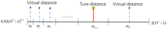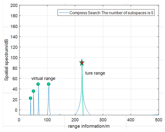 Then, we substitute the azimuth information of the m-th near-field source into Formula (42) and search the whole Fresnel region to obtain the distance information, including a true distance and false distances . From another perspective, there is a real distance corresponding to false distances, which is shown in Figure 3.
