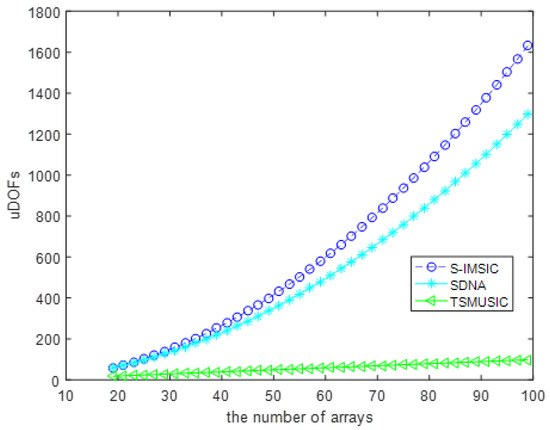 This section compares the uniform DOFs of the proposed algorithm against the TSMUSIC algorithm and SDNA. We assume that there are 2N−1 arrays, the uniform DOFs of the proposed algorithm are , and the uniform DOFs of the TSMUSIC algorithm are 2N−2. The SDNA algorithm is quite complex and considers two cases. If is odd, the uniform DOFs are , and if is even, the uniform DOFs are . From the above analysis, we conclude that the proposed algorithm has more uniform DOFs than TSMUSIC and SDNA. The uniform DOFs of the proposed algorithm and comparison algorithms is shown in Figure 4.