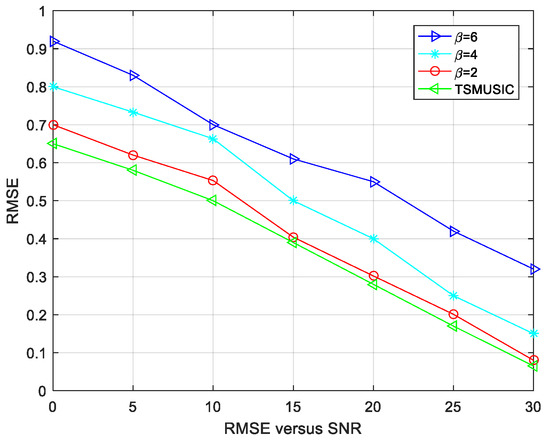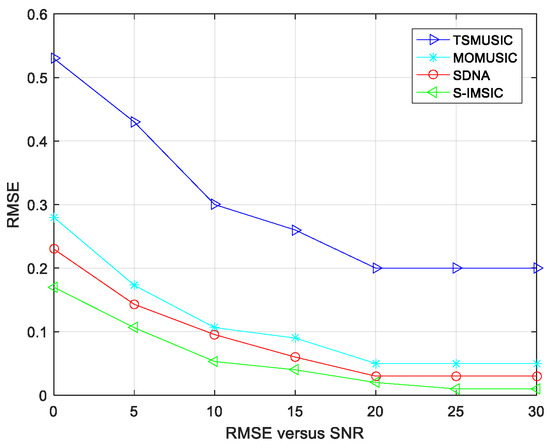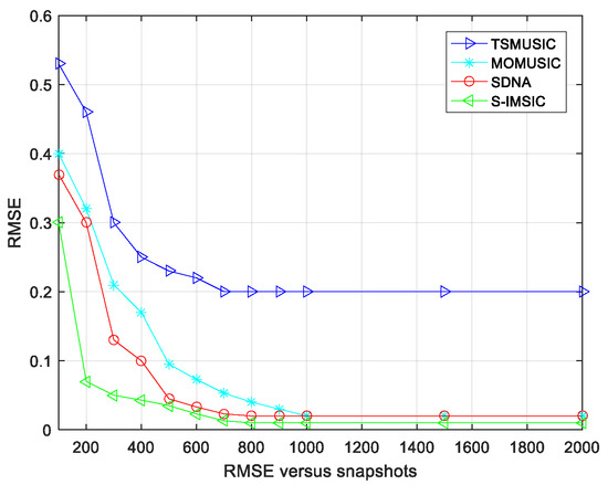 Figure 5 depicts the RMSE of the near-field source angle estimates versus the SNR, revealing that the RMSE of the three algorithms decreases as the SNR increases. Moreover, the S-IMSIC array model has a smaller RMSE than the competitor array models. Figure 6 illustrates the RMSE of the near-field source angle estimates versus the number of snapshots, inferring that the RMSE of the three algorithms decreases as the number of snapshots increases. Additionally, the S-IMSIC array model has a smaller RMSE than the competitor models. The S-IMISC array model adopted by the proposed algorithm can thus greatly reduce the effect of the mutual coupling. Meanwhile, the algorithm proposed in this article utilizes the root polynomial method with better parameter estimation performance, which not only reduces computational complexity, but also ensures that accuracy is not affected by the search step size. This further improves estimation accuracy. Therefore, the performance of the S-MISC array model adopted by the proposed algorithm is better than that of the other methods.