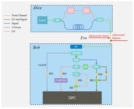 The schematic diagram for the attack detection portion of the CVQKD system considering adversarial attacks and defenses. The attack from Eve includes normal attacks and adversarial perturbations. PC: polarization controller. CWDM: coarse wavelength-division multiplexing. PBS: polarization beam splitter. BS: beam splitter. AM: amplitude modulator. PM: phase modulator. PIN: PIN photodiode. HD: homodyne detector. P-METER: the power meter is to monitor LO intensity. DPC: data processing center used to sample analog signal, and attack detection.